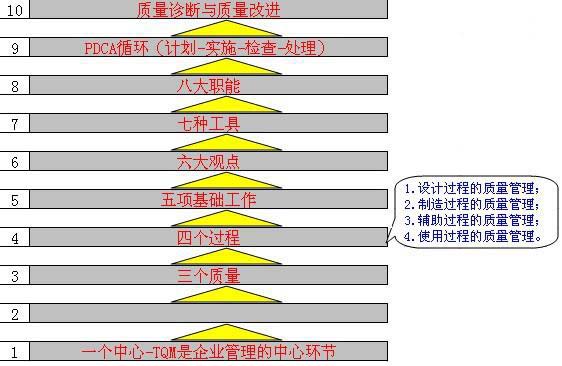 我們把TQM概括為:"一個(gè)中心、兩個(gè)方針、三個(gè)質(zhì)量、四個(gè)過程、五項(xiàng)基礎(chǔ)、六個(gè)觀點(diǎn)、七種工具、八大職能、PDCA、質(zhì)量診斷與質(zhì)量改進(jìn)等十個(gè)方面。